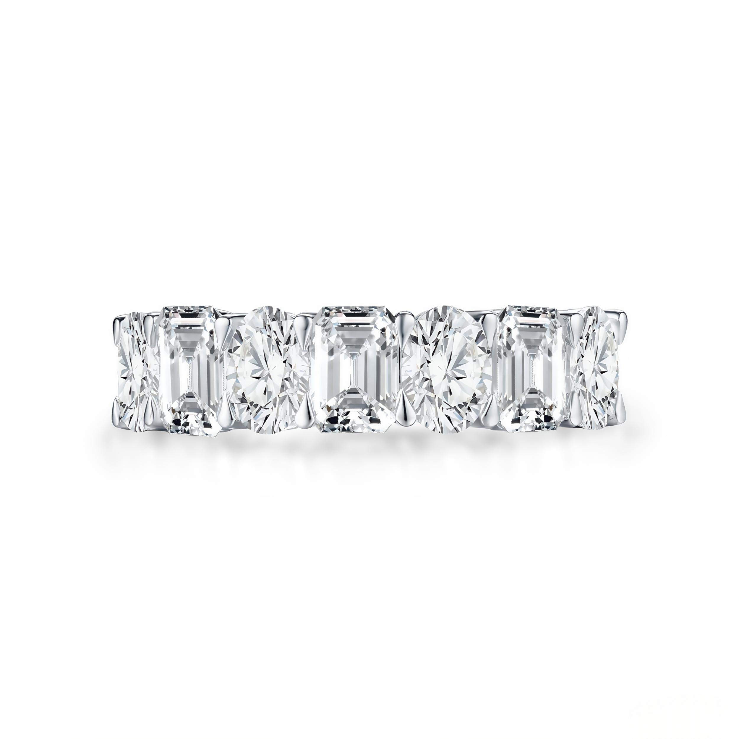 This eternity band showcases a captivating array of diamonds with mixed cuts, including emerald and oval cuts. Crafted with either lustrous platinum or warm 18K gold for the band, it offers versatile elegance. The alternating diamond shapes create a luxurious and eye - catching look, perfect for symbolizing everlasting love. Each diamond is meticulously set to maximize its brilliance, making the band a radiant choice, whether for commemorating a special moment or adding glamour to daily wear.