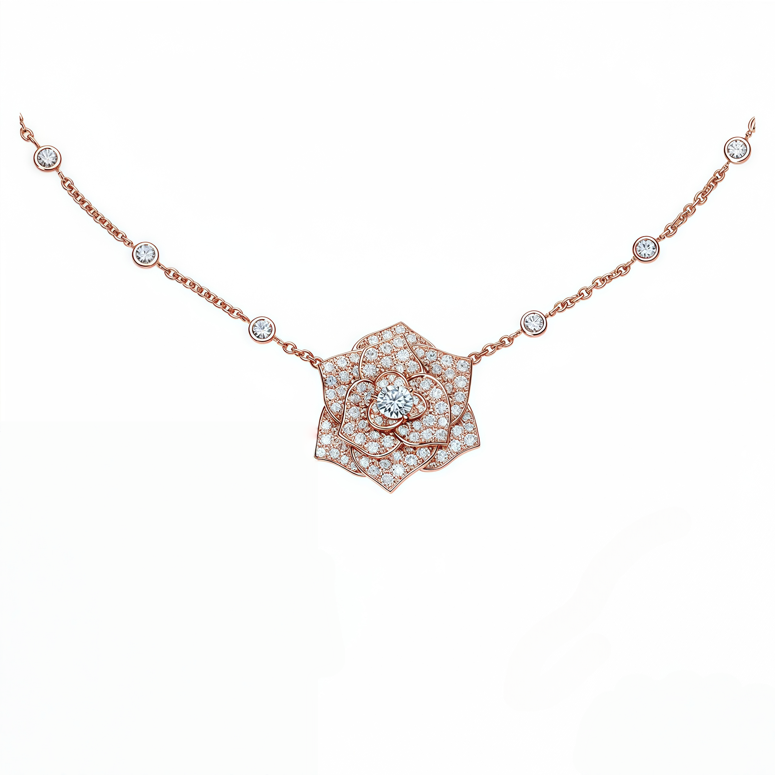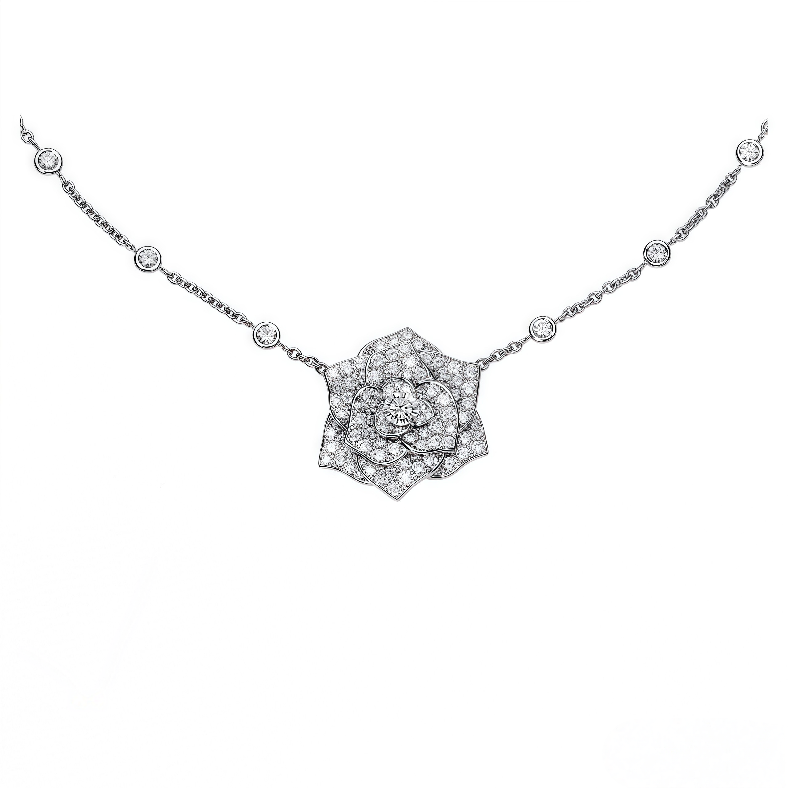 Masterful artistry in every petal. This luxurious necklace showcases a dimensional floral bloom, meticulously handset with hundreds of stones to create a brilliant, lifelike texture. The look is completed with a diamond-studded chain, adding an extra layer of sophistication to this exquisite statement piece.