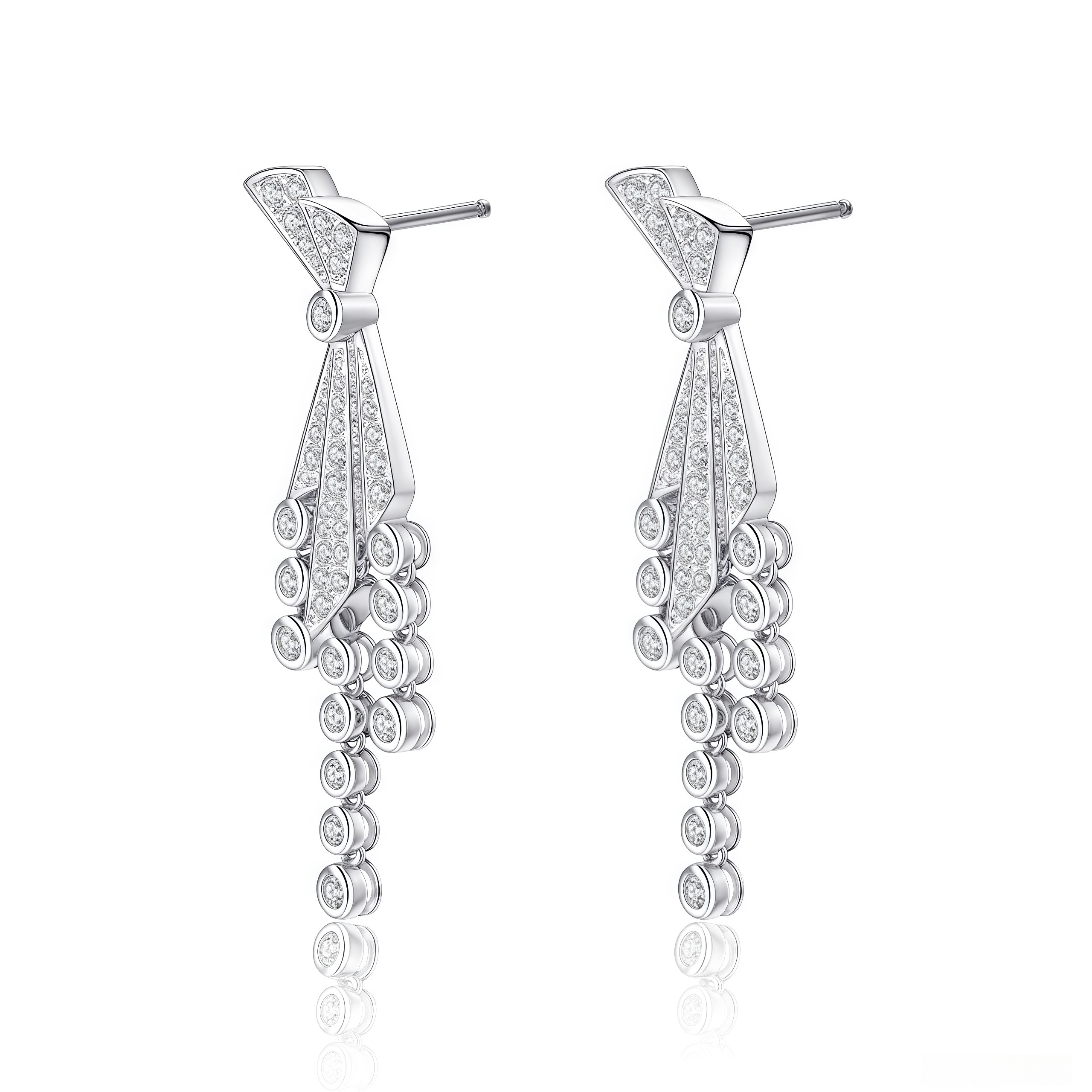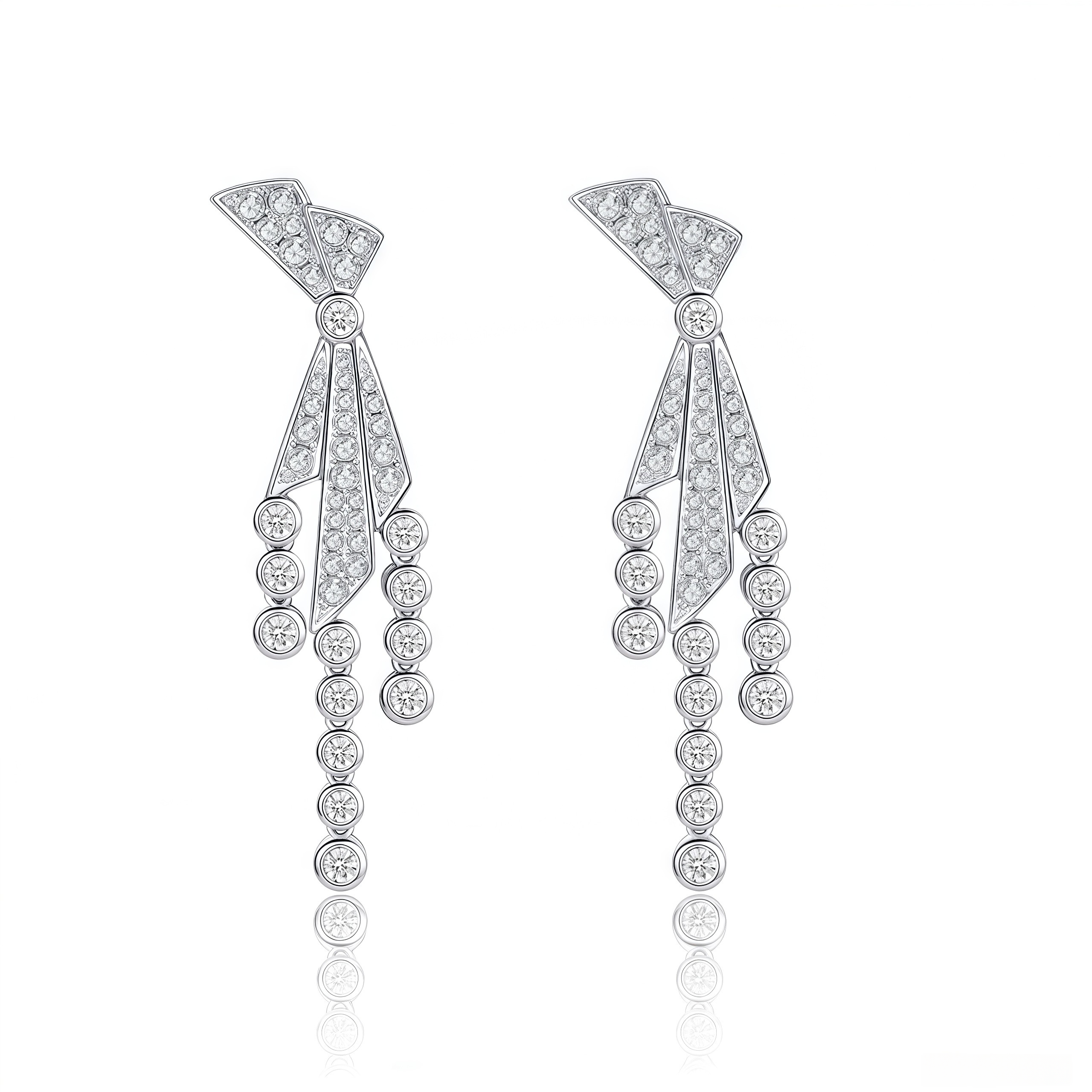 Playful meets sophisticated. These stunning earrings feature a sparkling diamond-encrusted bow that suspends delicate strands of bezel-set stones. With their fluid movement and feminine charm, they catch the light beautifully with every turn, making them the perfect finishing touch for a romantic evening or celebration.