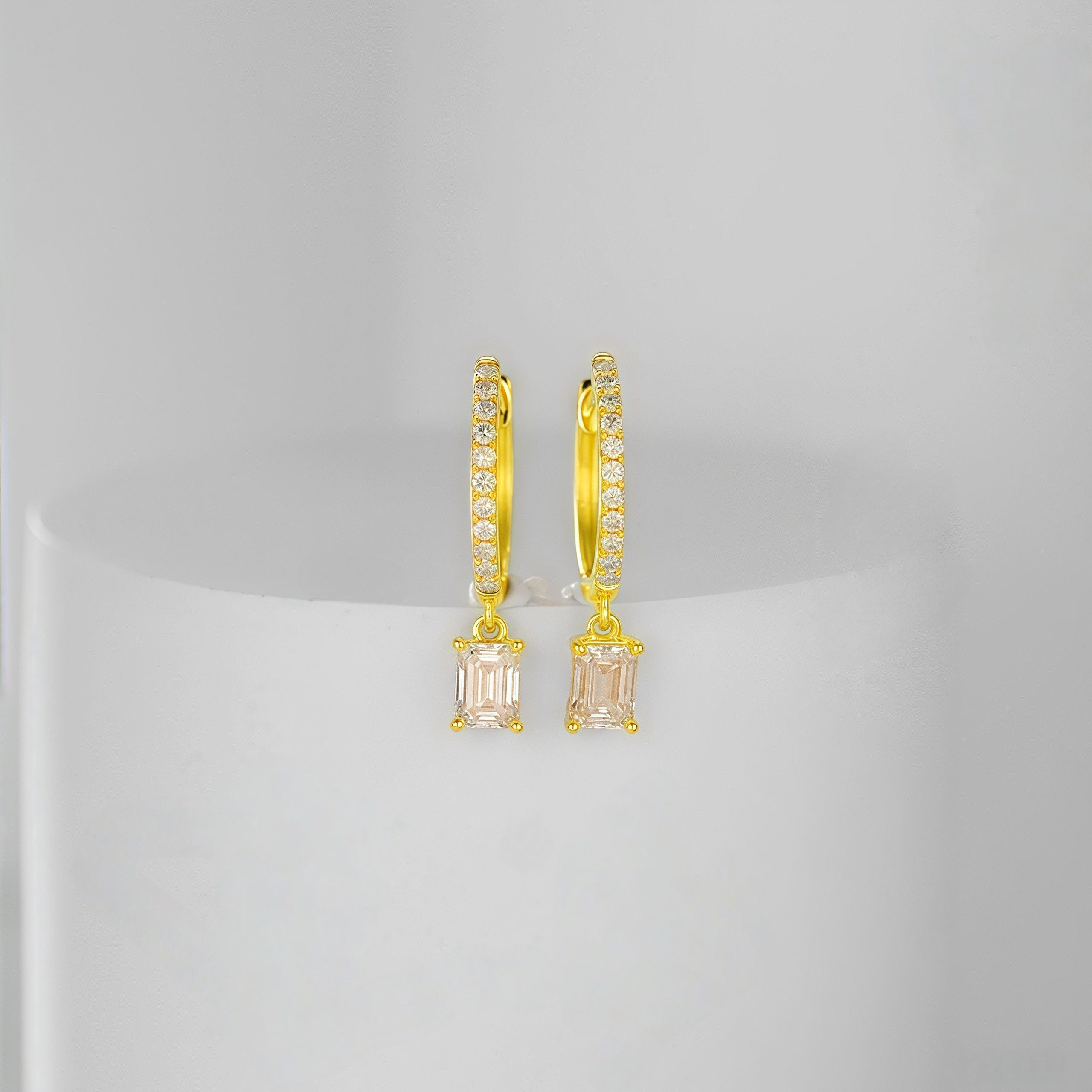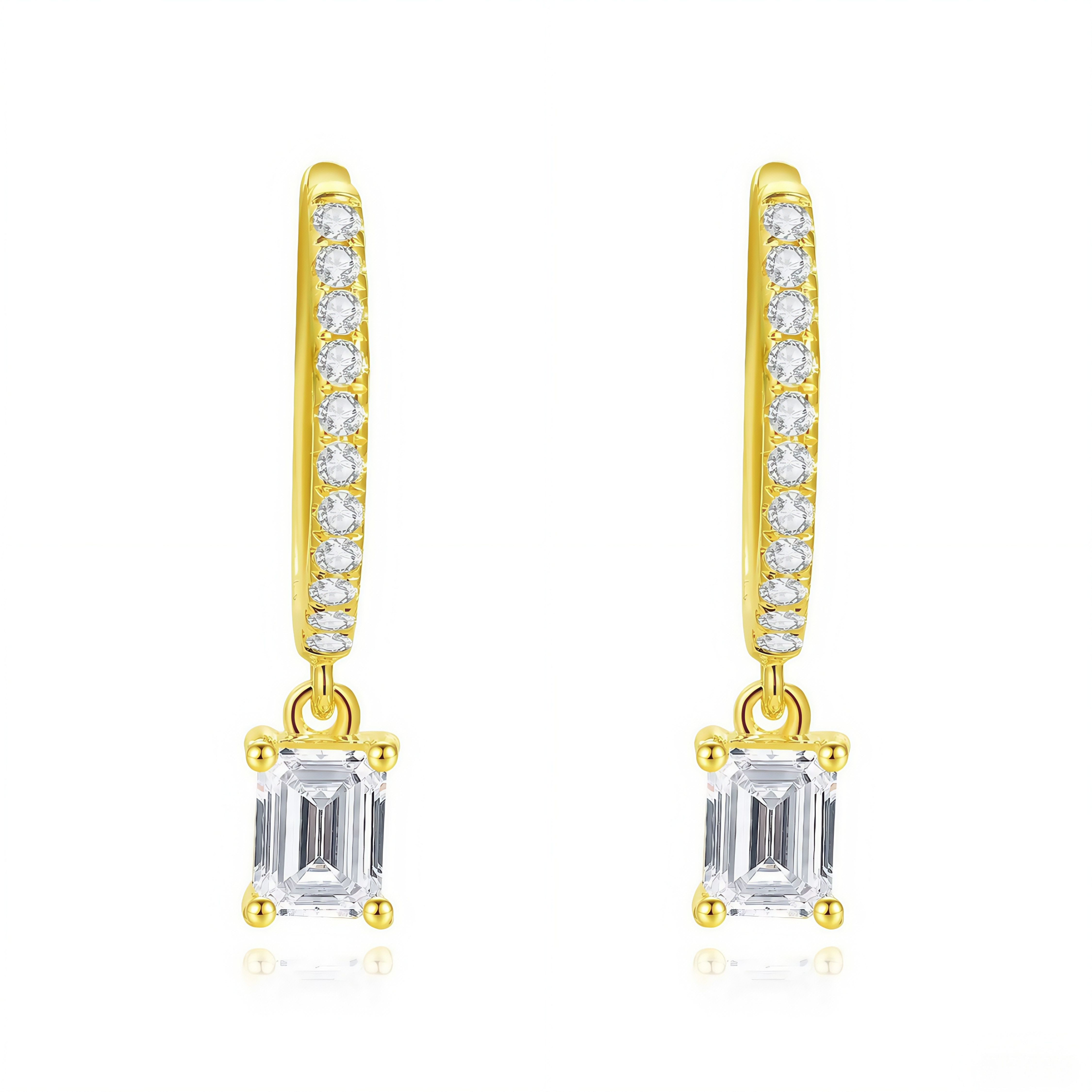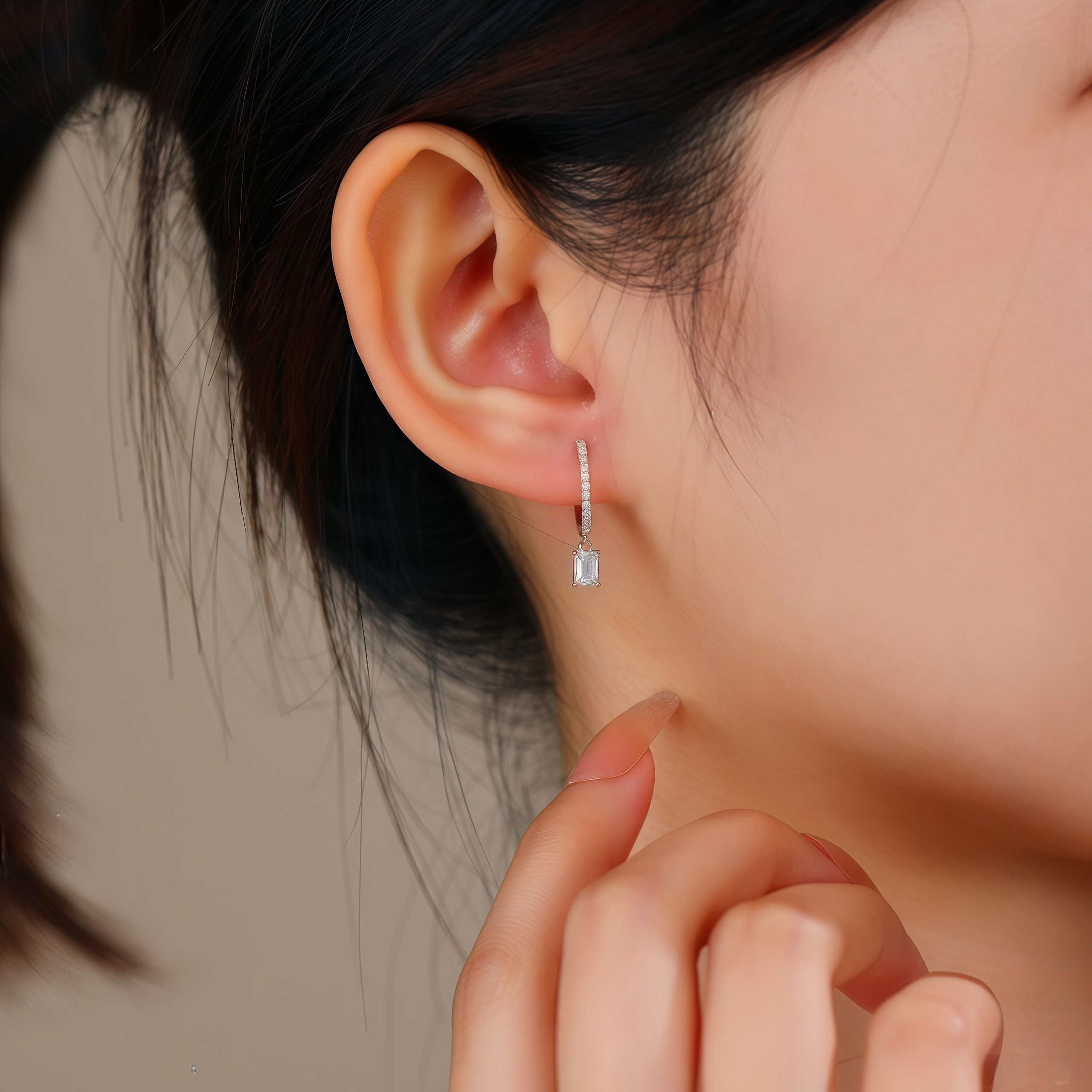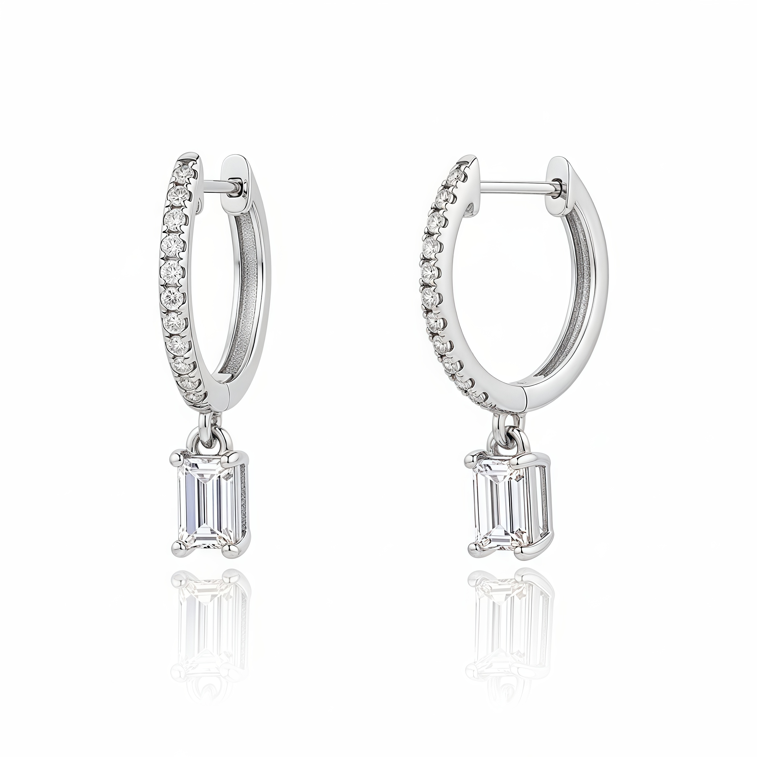 Movement meets majesty. These exquisite earrings pair the shimmering brilliance of a diamond-paved hoop with the cool, sophisticated clarity of an emerald-cut drop*. The step-cut stone dangles freely, catching the light with every turn of your head, creating a mesmerizing contrast between the glitter of the hoop and the icy flashes of the drop.