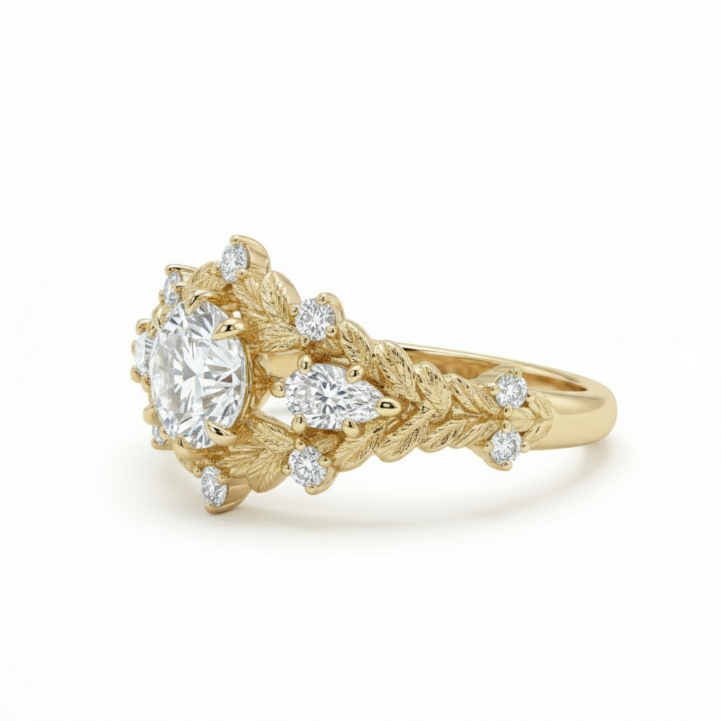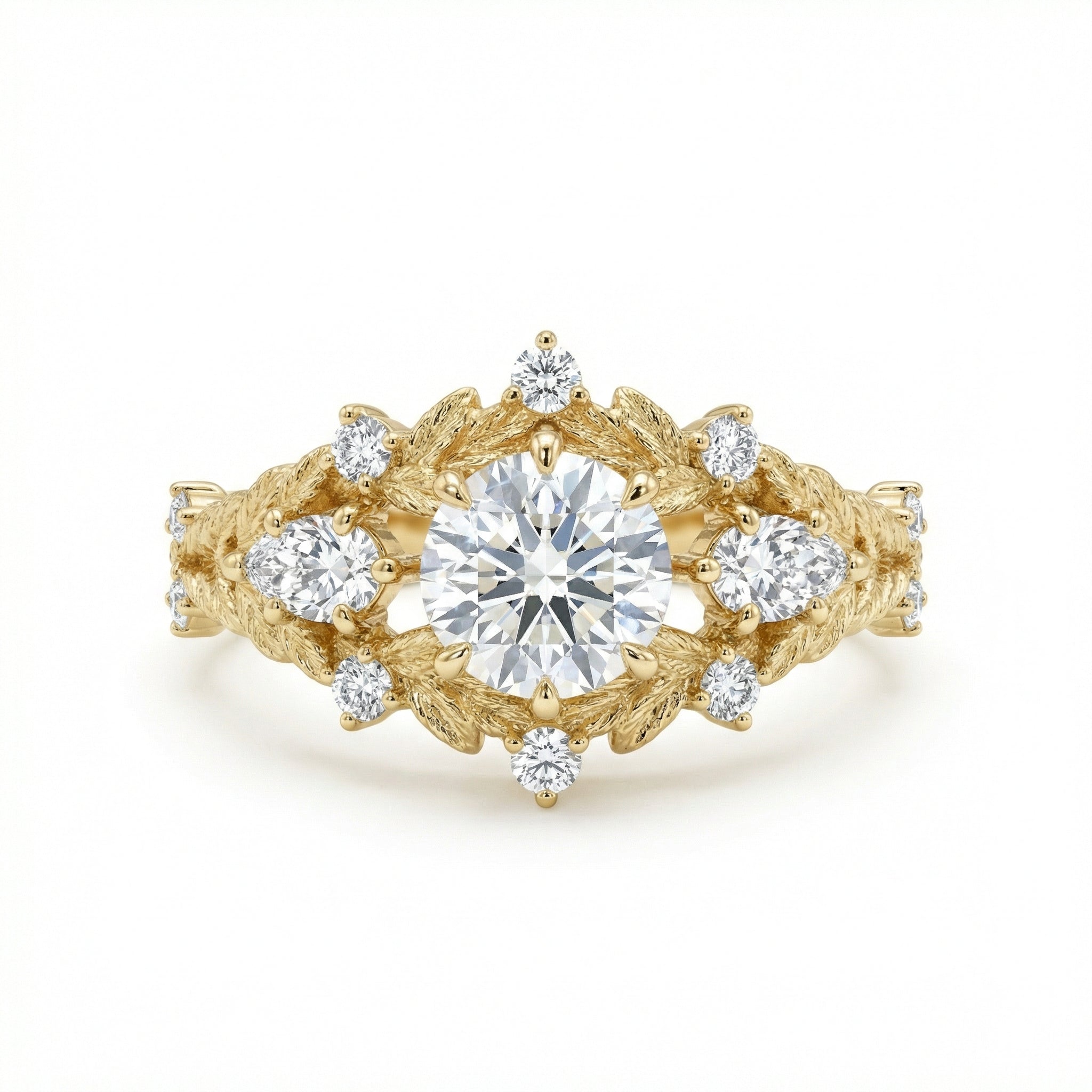 Straight out of a fairy tale. This breathtaking ring is a masterpiece of nature-inspired artistry, featuring a brilliant round center diamond blooming from a band of intricately sculpted gold leaves. Flanked by elegant pear-shaped side stones* and accented with scattered diamond "dewdrops," the textured vine design wraps around the finger like a golden embrace. Perfect for the bride who dreams of magic and romance.