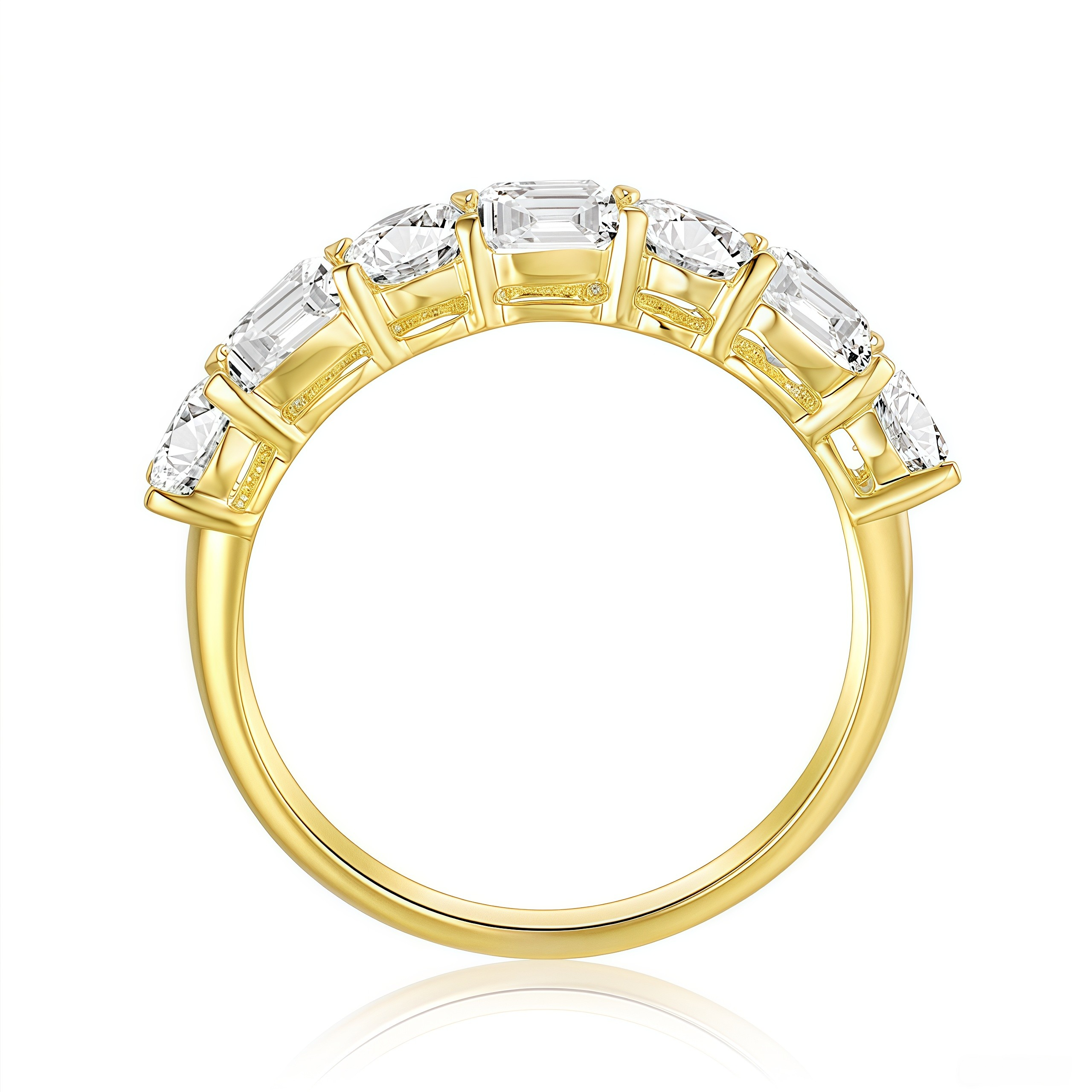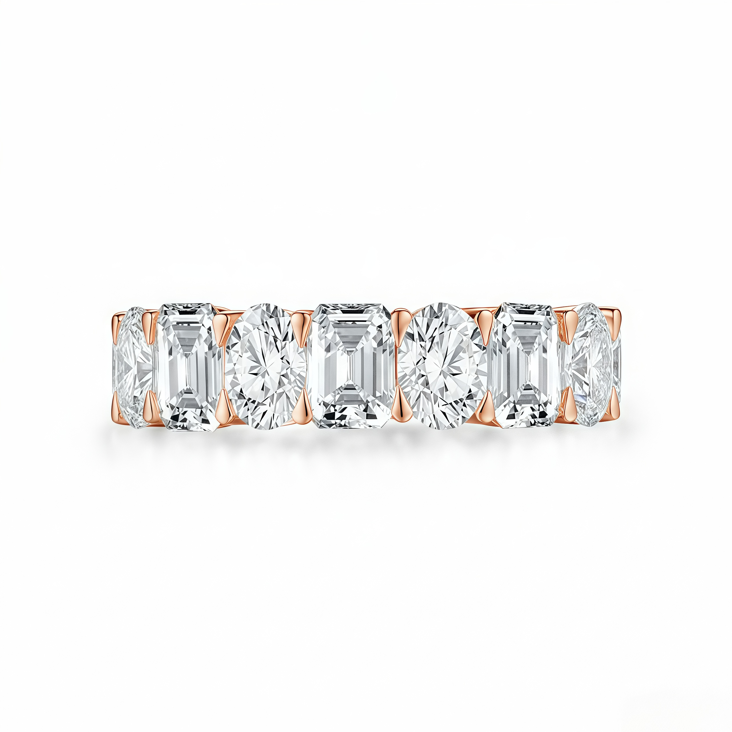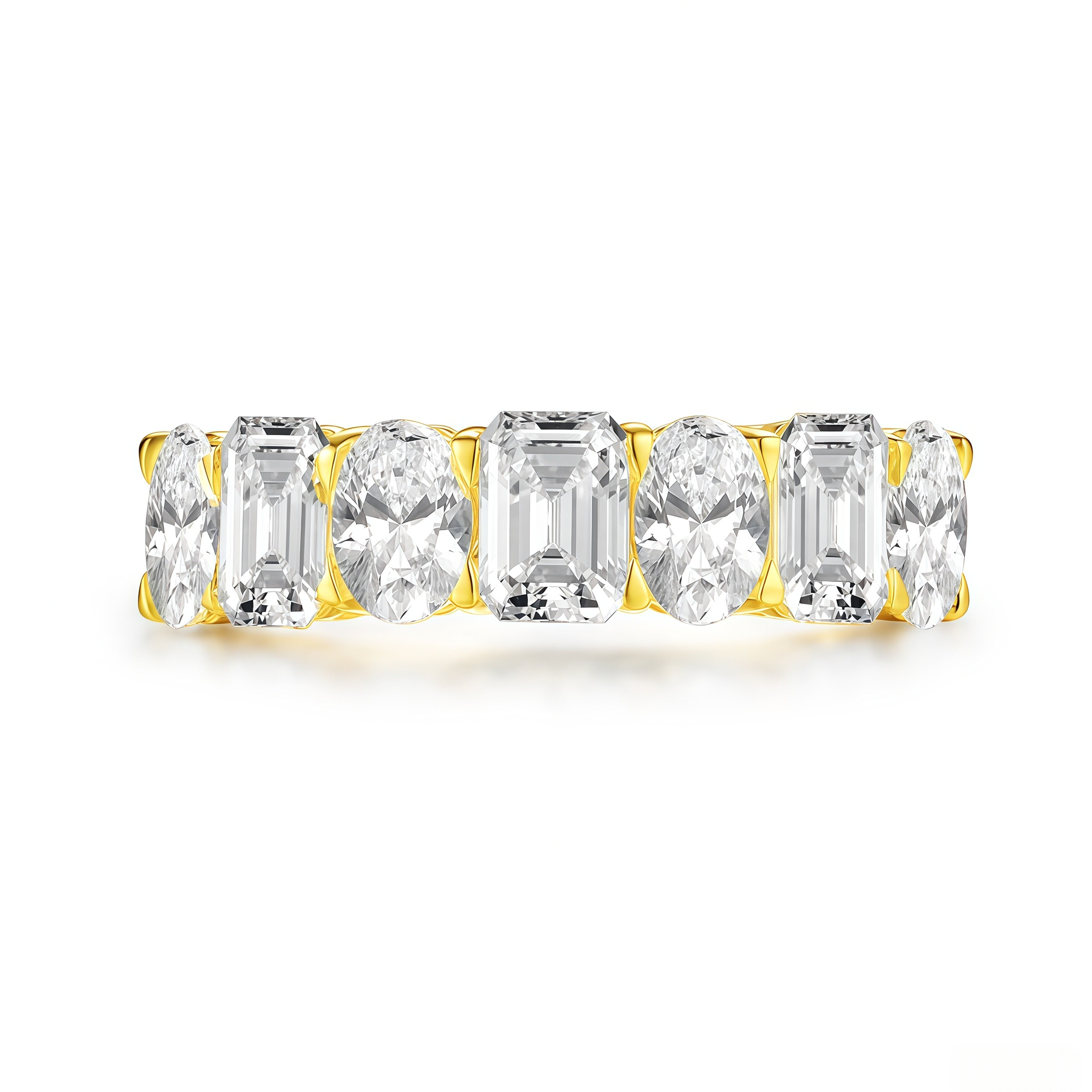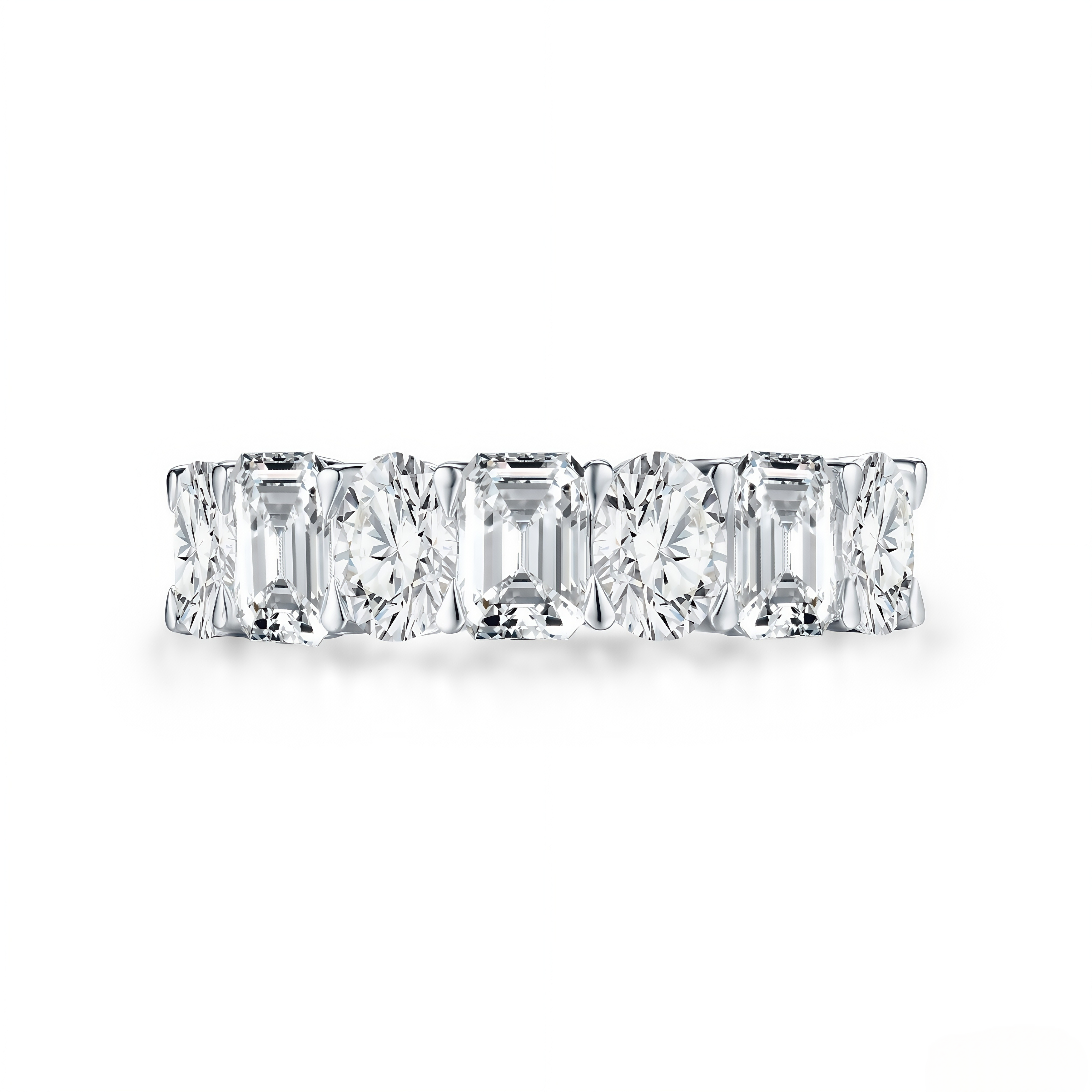 The step-cut facets of the Emerald cuts offer deep, mirror-like clarity, while the brilliant facets of the Ovals provide explosive sparkle. Together, they create a sophisticated texture and rhythm around your finger. Whether worn alone as a statement piece or stacked with your engagement ring, this band proves that opposites really do attract.