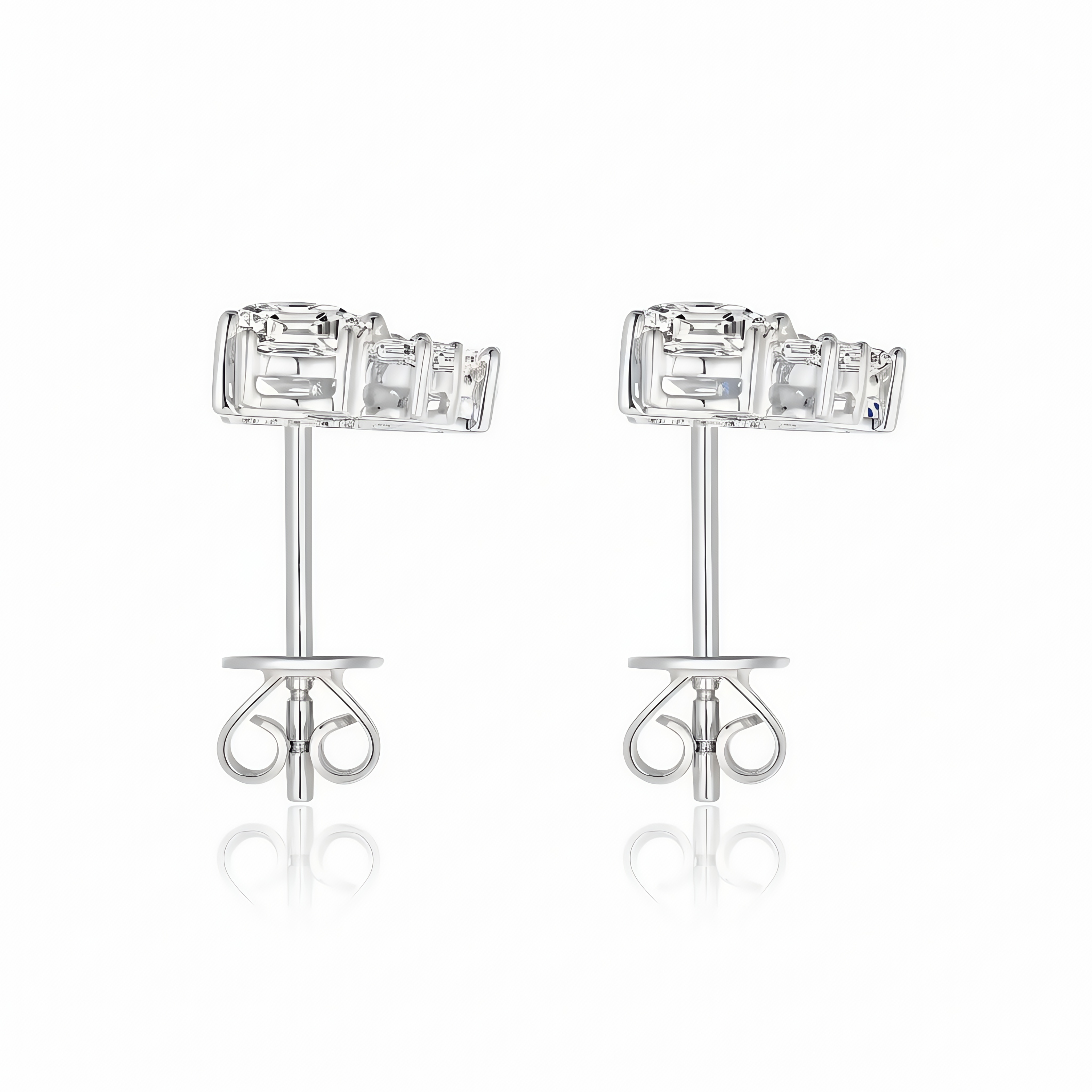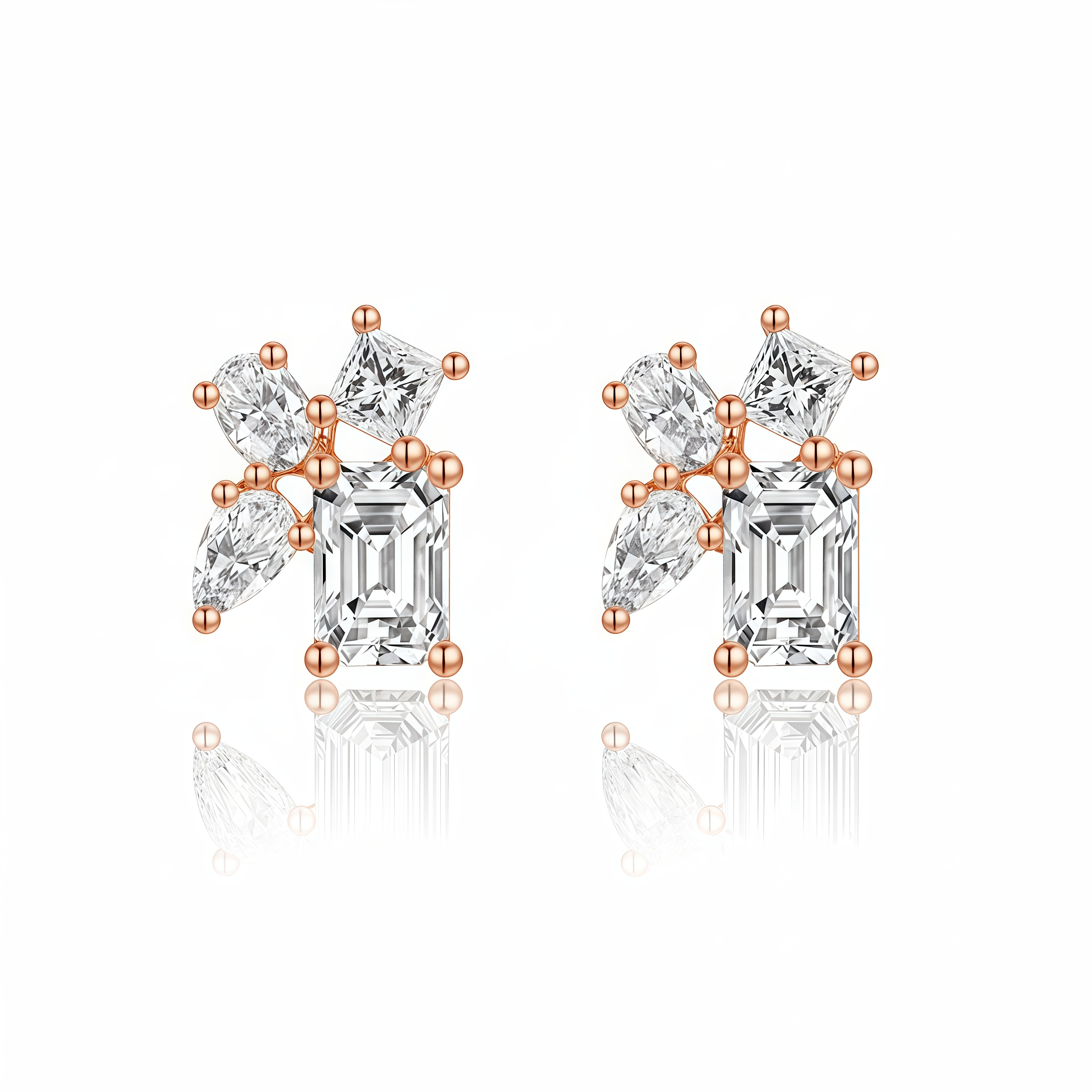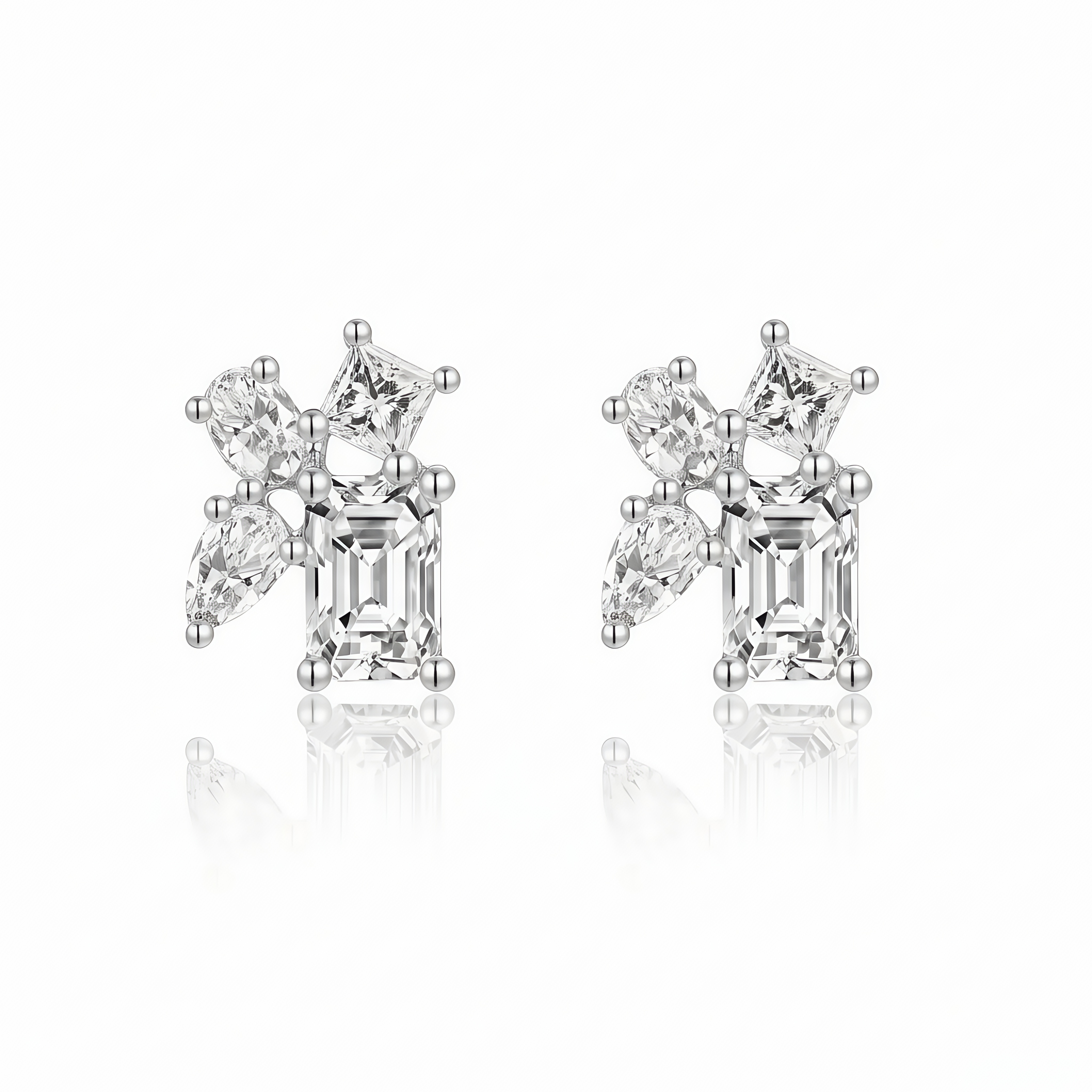 Contemporary art for your ears. These striking studs feature a bold emerald-cut diamond* anchored by an artistic cluster of mixed fancy shapes—including pear and princess cuts. The contrast between the clean step-cut geometry and the brilliant accents creates a dynamic, high-fashion look that is anything but ordinary.