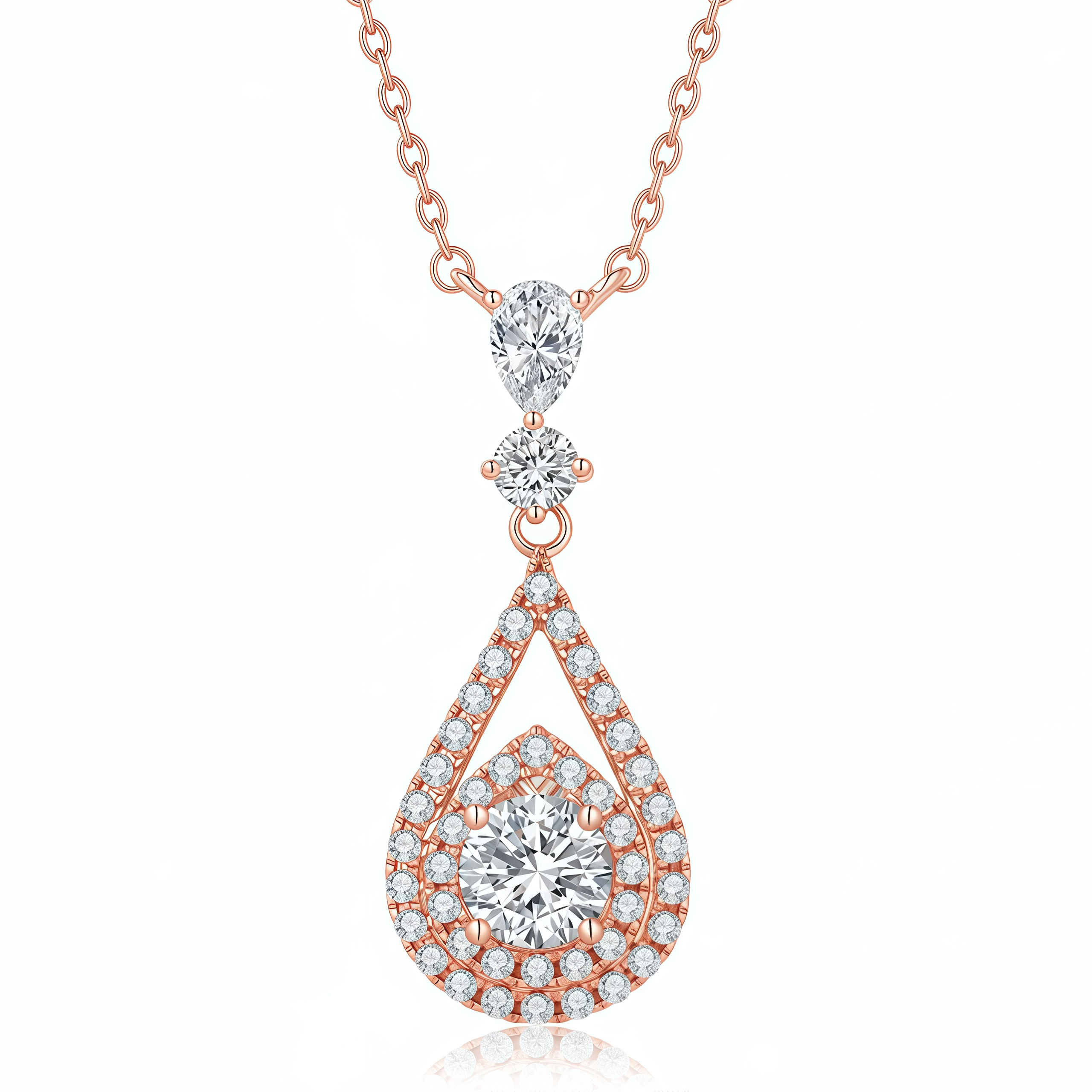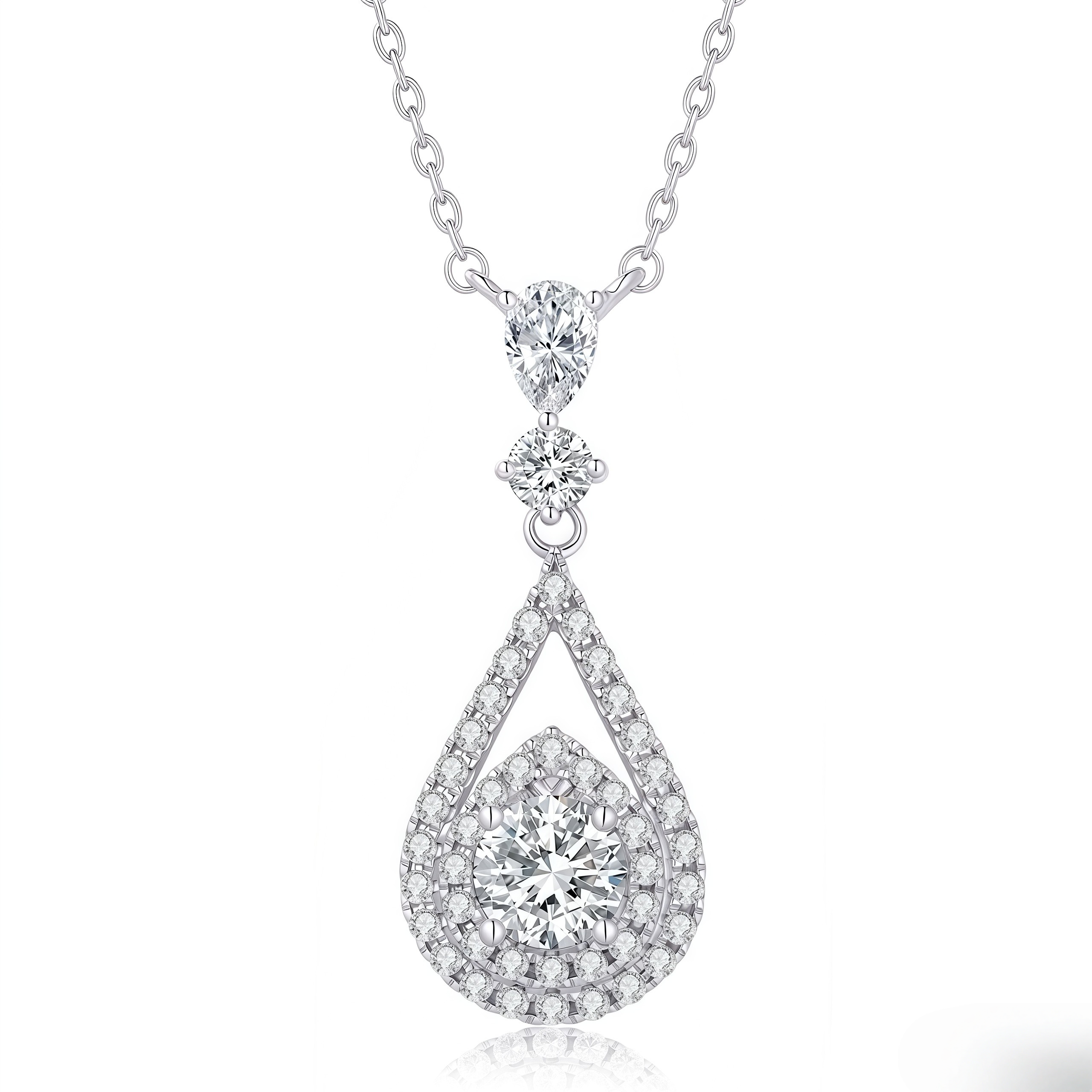 A cascade of brilliance. This breathtaking necklace features a tiered design, starting with a delicate pear bail that flows into a round brilliant connector, finally suspending a magnificent pear-shaped stone framed by a sparkling halo. Designed to capture attention, it offers a dramatic, light-catching silhouette perfect for your most memorable moments.