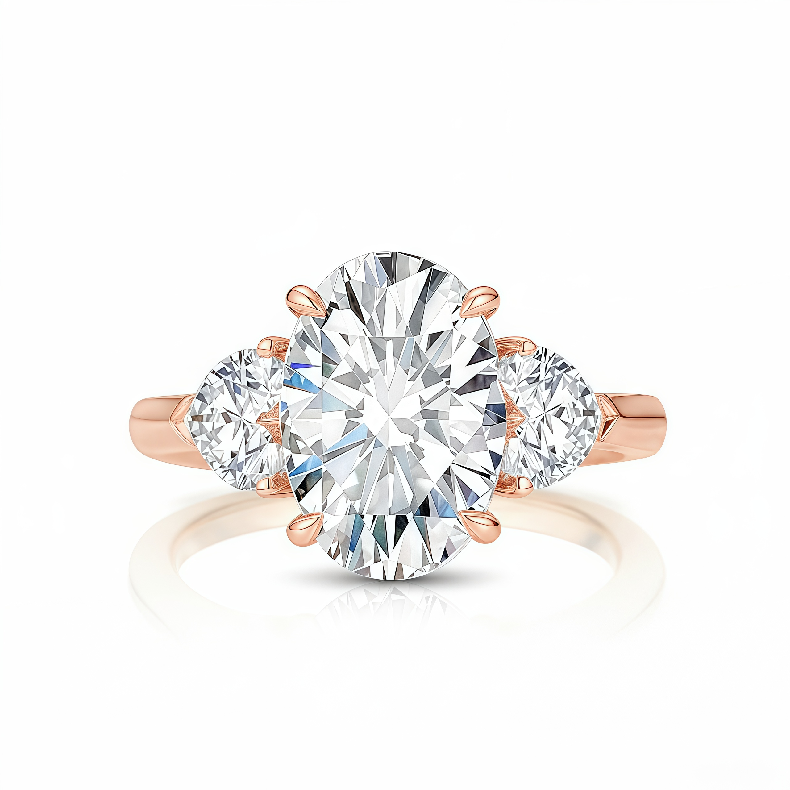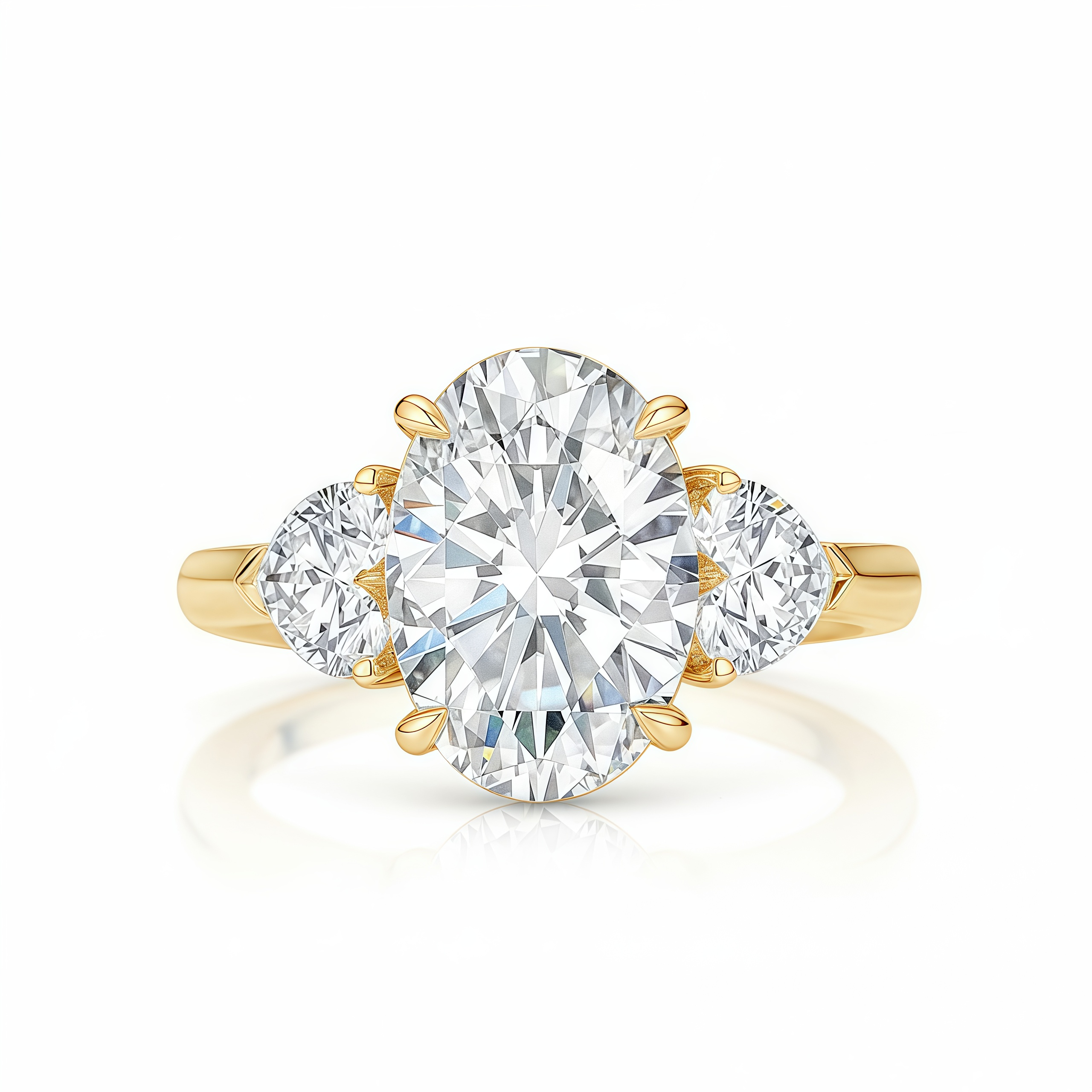 The hearts are set with their curves gently embracing the center stone, symbolizing two souls supporting one shared life. The elongated Oval cut creates a flattering, slenderizing effect on the finger, while the side hearts add a touch of sentimental charm that sets this ring apart from the ordinary.